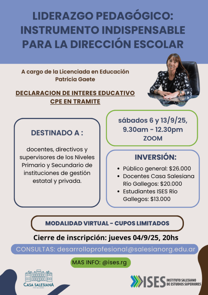 Los invitamos a participar del taller virtual «Liderazgo Pedagógico: Instrumento indispensable para la Dirección Escolar», a cargo de la Lic. Patricia Gaete. -Sábados 6 y 13/9 de 2025, de 9.30am a 12.30pm. -Modalidad VIRTUAL (vía zoom institucional). -Declaración de Interés Educativo CPE en trámite.DESTINADO A Docentes, directivos y supervisores de los Niveles Primario y Secundario de instituciones de gestión